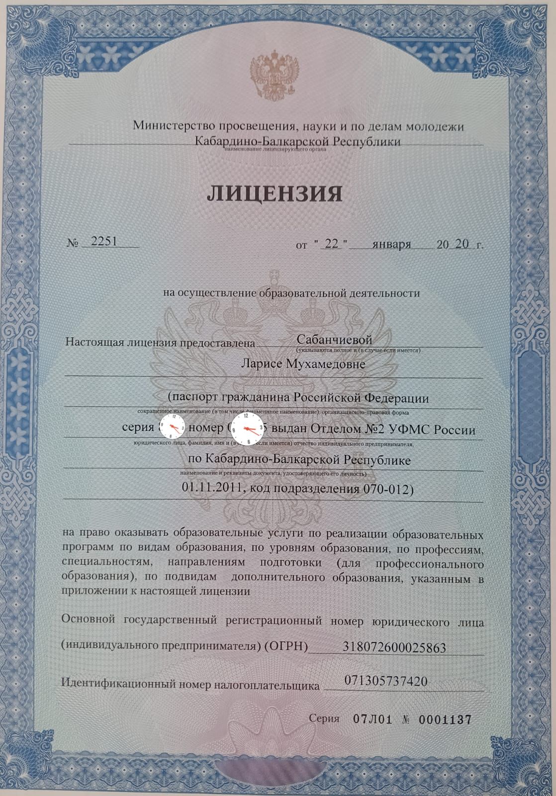 Лицензия Министерства просвещения, науки и по делам молодежи Кабардино-Балкарской Республики №2251 от 22.01.2020 г.