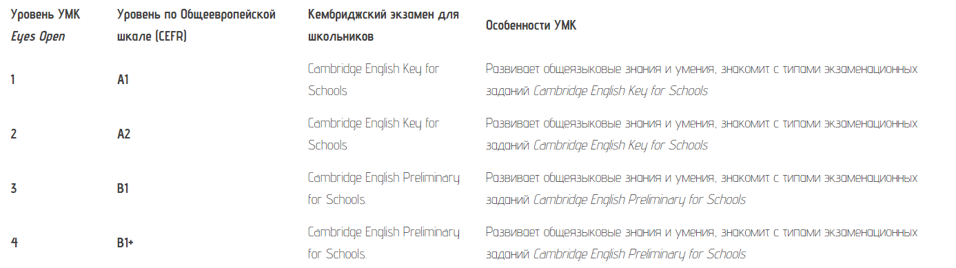 Eyes Open обеспечивает эффективное развитие всех языковых навыков в увлекательной форме. Познавательное видео расширяет кругозор учащихся и повышает мотивацию к изучению английского языка. Уроки межпредметных связей (CLIL) содержат интересный фактический материал. Специально разработанные уроки